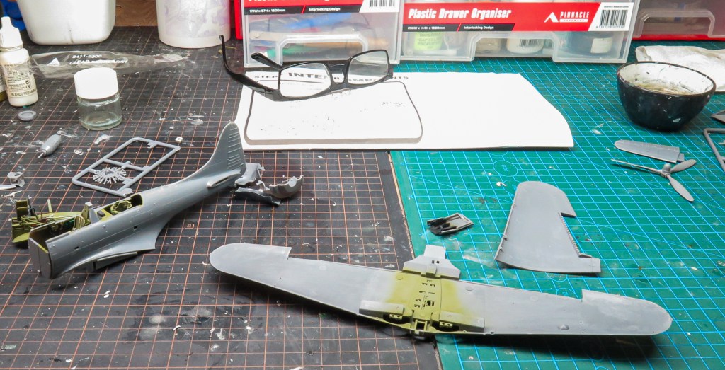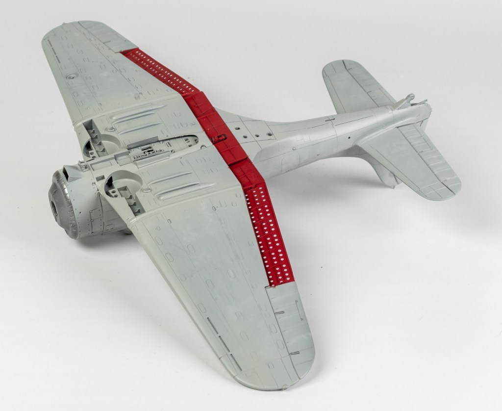 Very little filler was required on the model. The biggest application being where the bottom wing joins the fuselage. The fit here is not bad actually, and if the modeller doesn’t do as I did and manage to induce a step, it would just need some Mr Surfacer run around all the joins. However, my join needed an application of super glue to smooth it all out. During this process, the identification lights were drilled out to accept MV lenses. There is also a gap between the top dive brakes and ailerons that will need filling with plastic card.