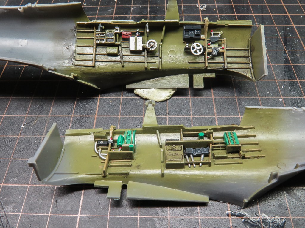 The cockpit was painted SMS Interior Green with details picked out using various Vallejo colours. Detail and Scale’s Dauntless book was used at the reference. AM supply clear plastic instrument panels with the dials being provided as a decal which is attached to the rear of the panel. The decals though are just black circles, so instead, the whole panel was painted black and drybrushed with various greys. The raised dial details were then touched in with a sharpened white pencil. A drop of gloss into each dial represented the glass. Seatbelts came from an Eduard SBD-5 set rather than using the lame kit supplied decal seatbelts. A point of annoyance with Eduard here. Eduard only give you lap belts though. No shoulder straps are provided at all. By the time of the -5, and indeed the -3, the USN was fitting shoulder harnesses . This is just Eduard being lazy again and probably relabelling an existing early Dauntless set.. All the cockpit components fitted securely in their given locations although the rear bulkhead on my kit needed a little bit of sanding to reduce its width to enable the fuselage halves to close without any gaps.