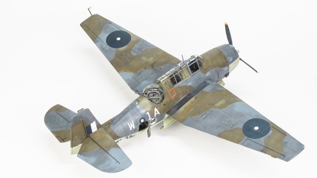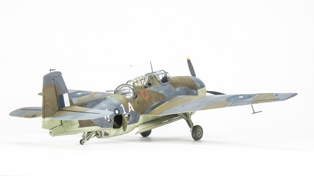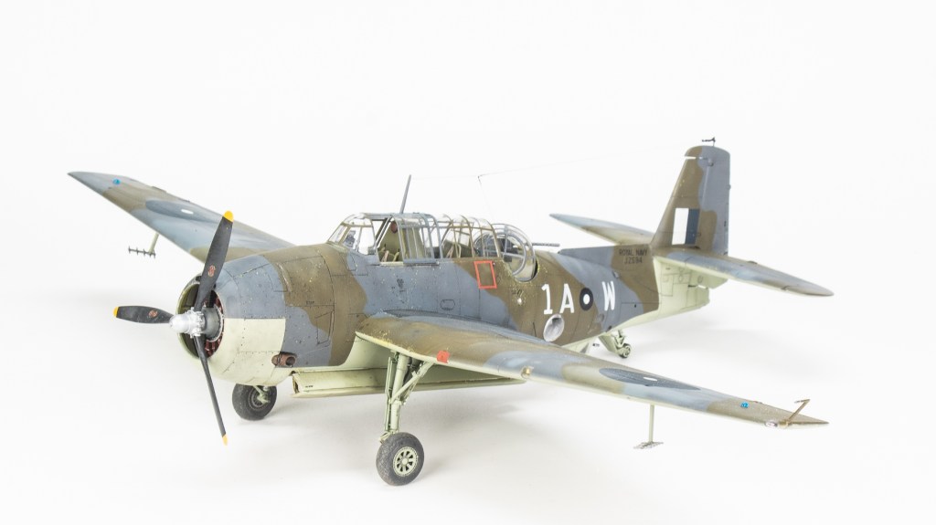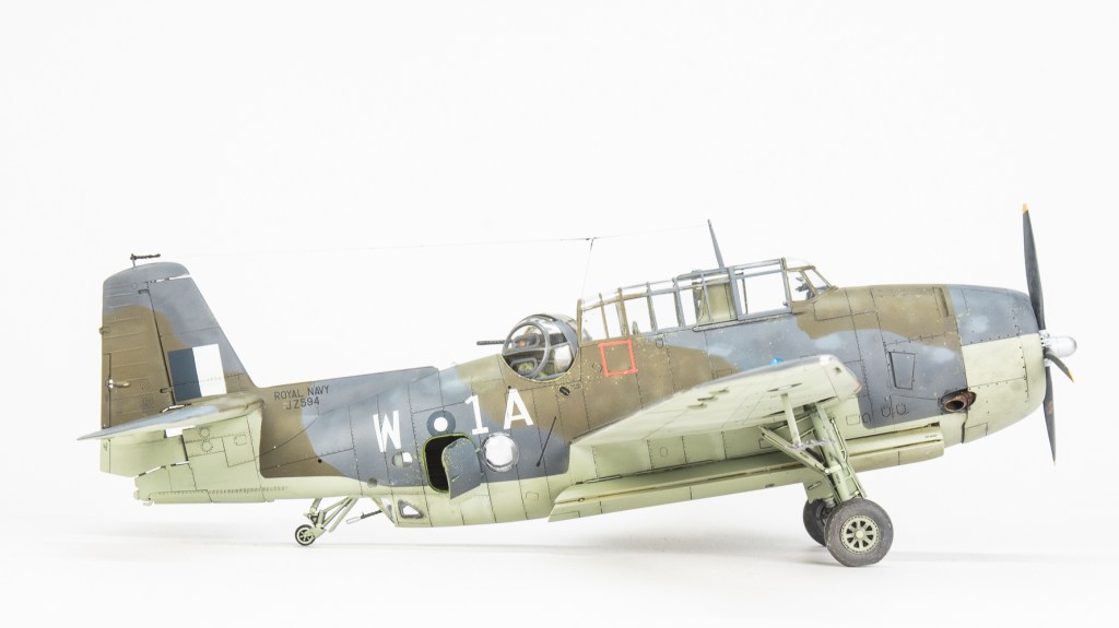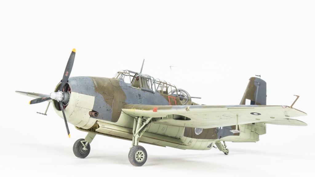 Being Eastern Motors built, my Avenger would be wearing ANA substitute colours. As far as the modeller is concerned, the main difference from the standard FAA colours is the use of ANA613 Olive Drab instead of Dark Slate Grey. MRP ANA Olive Drab was used for this The other colour used on the topside was ANA612 Sea Grey, which is pretty much Extra Dark Sea Grey. Tamiya XF24 standing in for this colour. All colours were lightened a touch with white. Undersides were Sky ANA 610. This shade was mixed from Tamiya colours using a recipe found on Britmodeller. After careful mixing, I was quite surprised the resultant colour wasn’t that far removed from RAF Sky, perhaps a touch greener. I was expecting a greyer colour as that’s what I have seen used on other models on line. For future FAA models of aircraft painted in ANA colours, I’ll just use a RAF sky straight from the jar. All these colours were gone over with lightened and darkened mixes of each colour to make the aircraft look weatherbeaten and patched up in appearance. Reading about the raids conducted by these aircraft, very few escaped unscathed, in fact I would not be surprised if this actual aircraft was lost. All this battle damage repair, Im sure would have lead to a multi hued surface, and then there is fading and being exposed to the elements on flight decks to contend with.