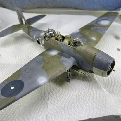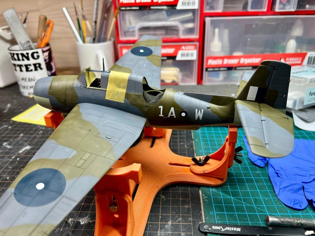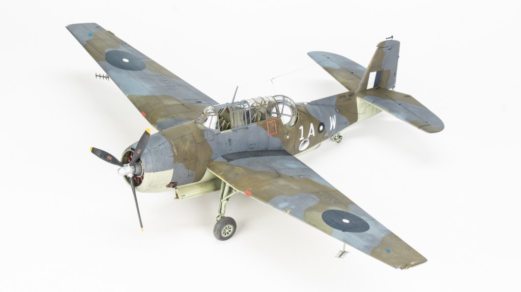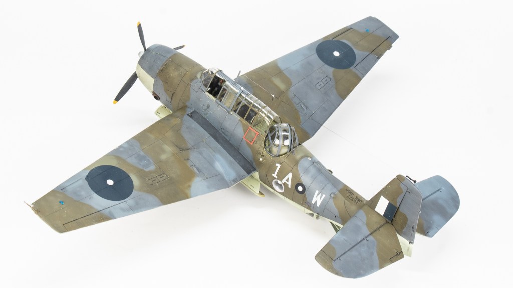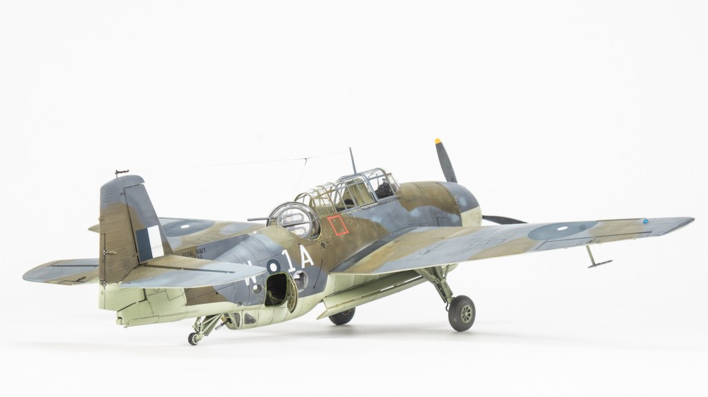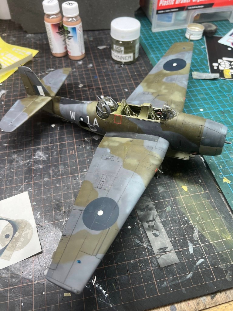 Being Eastern Motors built, my Avenger would be wearing ANA substitute colours. As far as the modeller is concerned, the main difference from the standard FAA colours is the use of ANA613 Olive Drab instead of Dark Slate Grey. MRP ANA Olive Drab was used for this The other colour used on the topside was ANA612 Sea Grey, which is pretty much Extra Dark Sea Grey. Tamiya XF24 standing in for this colour. All colours were lightened a touch with white. Undersides were Sky ANA 610. This shade was mixed from Tamiya colours using a recipe found on Britmodeller. After careful mixing, I was quite surprised the resultant colour wasn’t that far removed from RAF Sky, perhaps a touch greener. I was expecting a greyer colour as that’s what I have seen used on other models on line. For future FAA models of aircraft painted in ANA colours, I’ll just use a RAF sky straight from the jar. All these colours were gone over with lightened and darkened mixes of each colour to make the aircraft look weatherbeaten and patched up in appearance. Reading about the raids conducted by these aircraft, very few escaped unscathed, in fact I would not be surprised if this actual aircraft was lost. All this battle damage repair, Im sure would have lead to a multi hued surface, and then there is fading and being exposed to the elements on flight decks to contend with.
