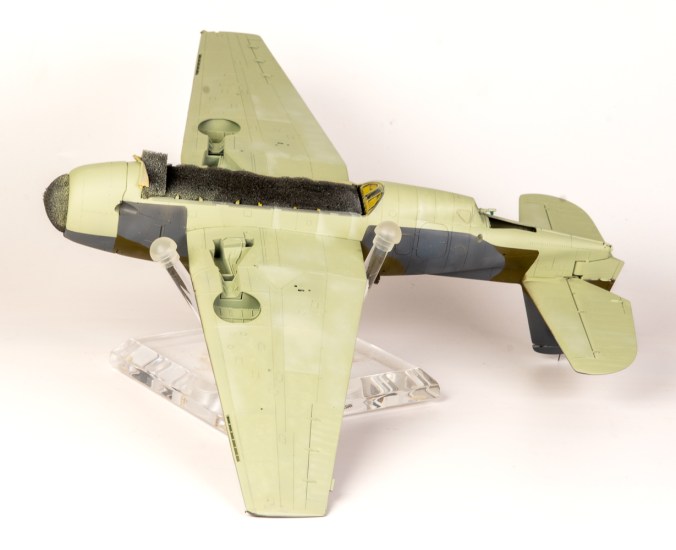 Modellers World grey brown wash was flowed into all the panel lines with the excess rubbed off. The transparencies were then added and that dreaded turret that everyone seems to complain about fitting. In the end, it actually wasn’t that difficult. My next Avenger post will contain step by step photos on the procedure. The landing gear was added and secures very securely into its large location slots. In fact, the engineering all through this kit was well thought out and resulted in a solid airframe. Quickboost exhaust pipes replaced the rather think kit parts. The were base coated dark earth and then stippled with rust and light grey tones. You will need to removed the small location tab in the fuselage exhaust cutouts before glueing the resin items in place. The transparencies were then unmasked and an aerial line added from EZline (Yes< I know I said I would not use this stuff again )