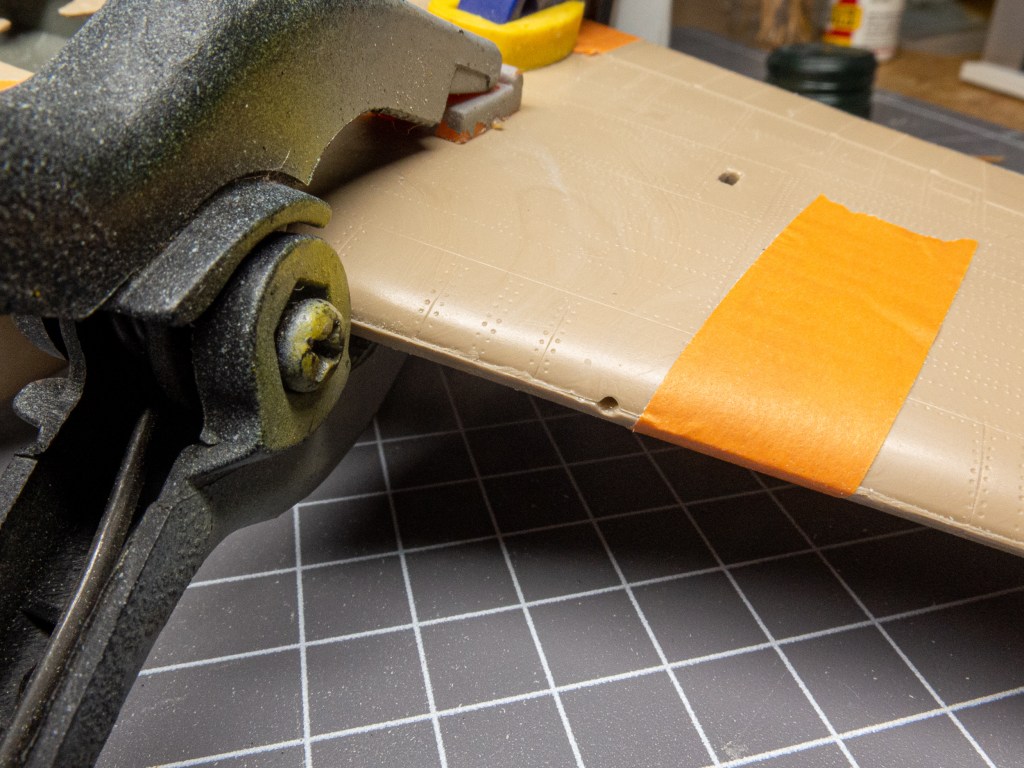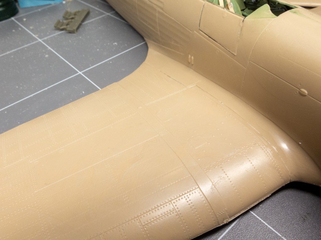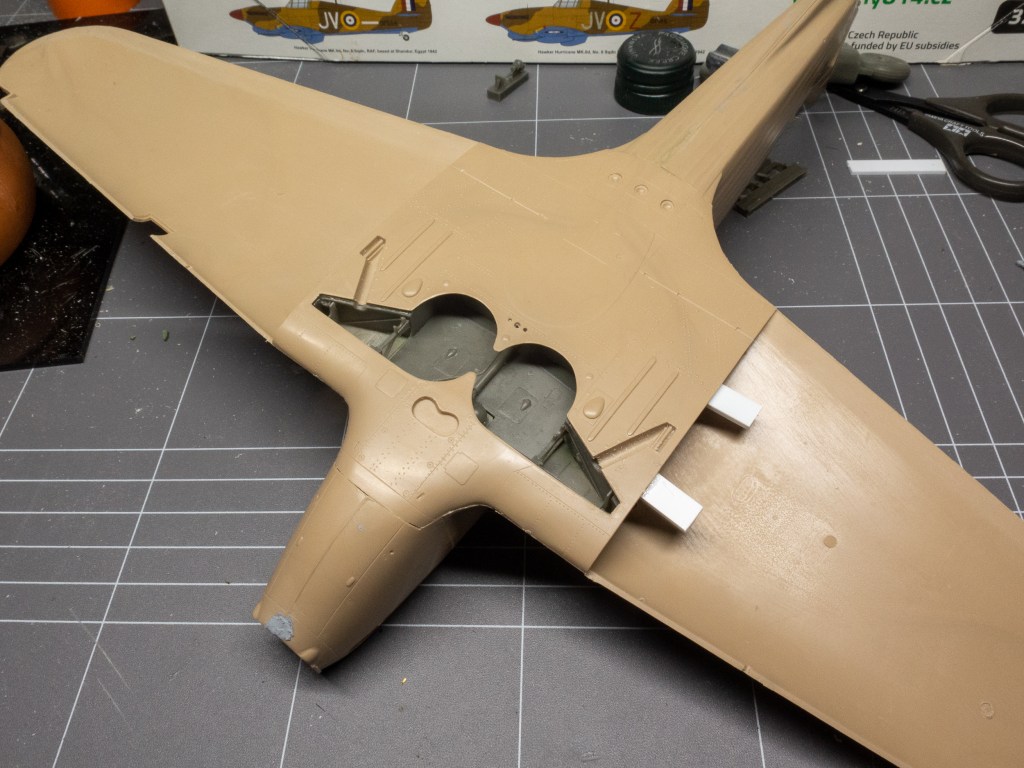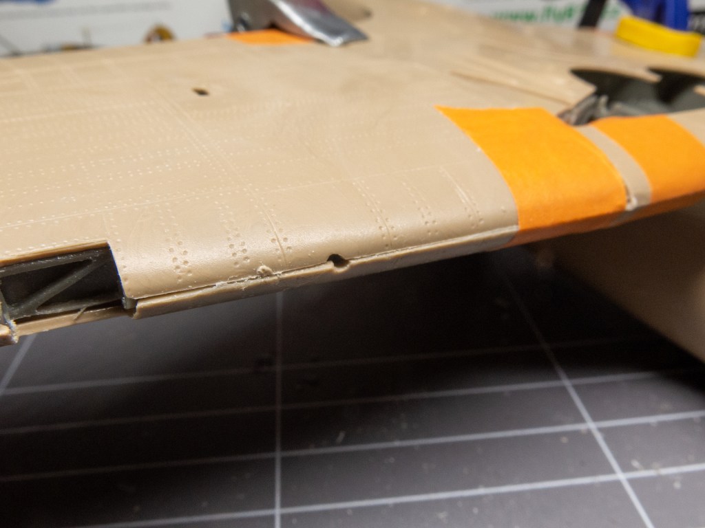 Out of the box, the kit wings do fit to the fuselage quite well, only problem is they are level, whereas the real wings had slight anhedral. Adding this to the kit wings left a slight gap on each top surface which was filled with Milliput